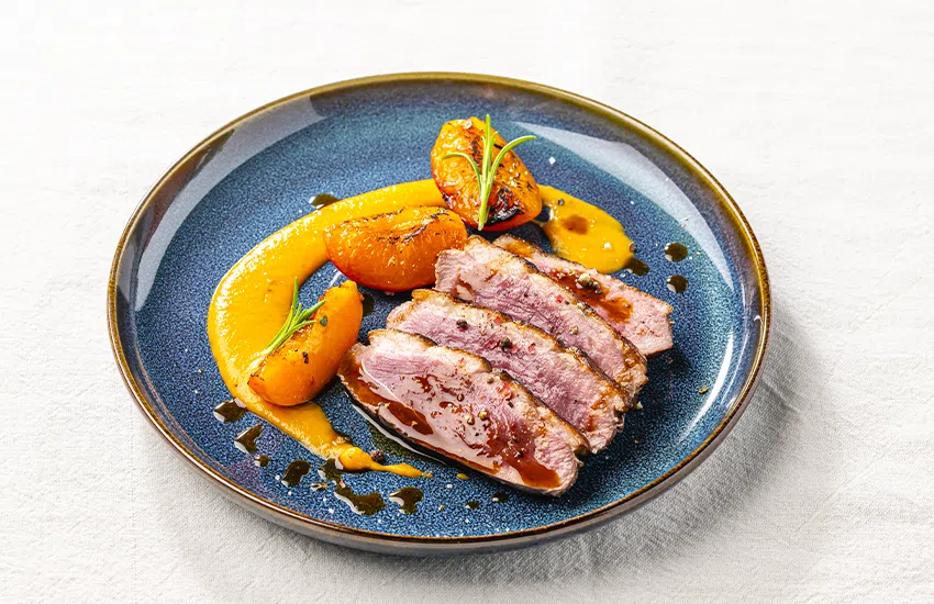 Eendenborsten met gekonfijte abrikozen, zoete aardappelpuree