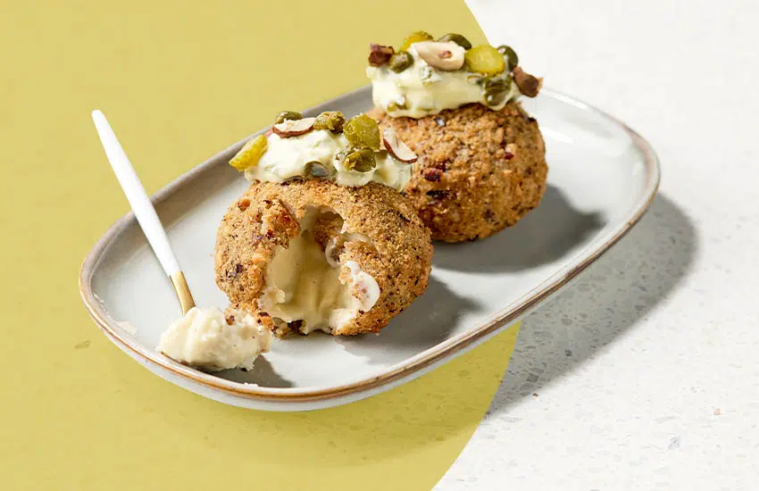 Kroketten van aardpeer, hazelnoot en gribichesaus
