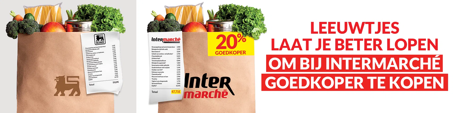 Op een selectie van 18 alledaagse producten (sinaasappelsap, gehakt van varkens- en kalfsvlees, macaroni met kaas en ham, tomatenpulp basilicum…) is Intermarché gemiddeld 20% goedkoper dan Delhaize :