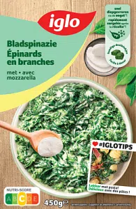 Bladspinazie met mozzarella – 450g, met Boursinkaas – 450g, met uien – 500g, Bio gehakt met roomsaus – 450g of Alpro soja R...