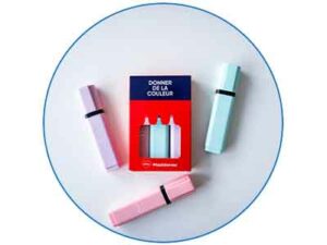 Bic-pen met vier kleuren in een roze/mauve verloop, met het Télévie-logo. Klassieke inkten: rood, zwart, groen en blauw.