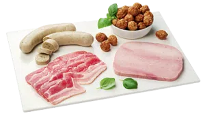 Bevat: ± 100g gezouten spek ± 100g pensen met fijne kruiden ± 100g barbecueham Meesterlyck ± 100g miniballetjes – 20g...
