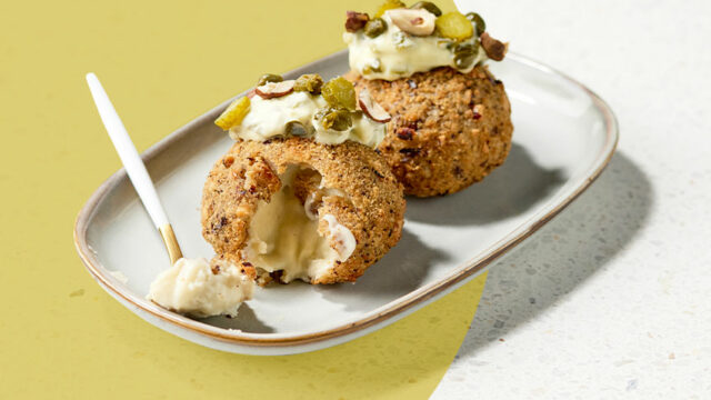 Kroketten van aardpeer, hazelnoot en gribichesaus