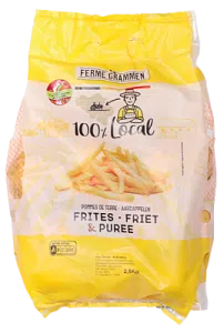 Pommes de terre Pour frites ou à Chair ferme Cat.: 1 – Orig.: Belgique 100% local et de Wallonie En sac de 2,5kg...